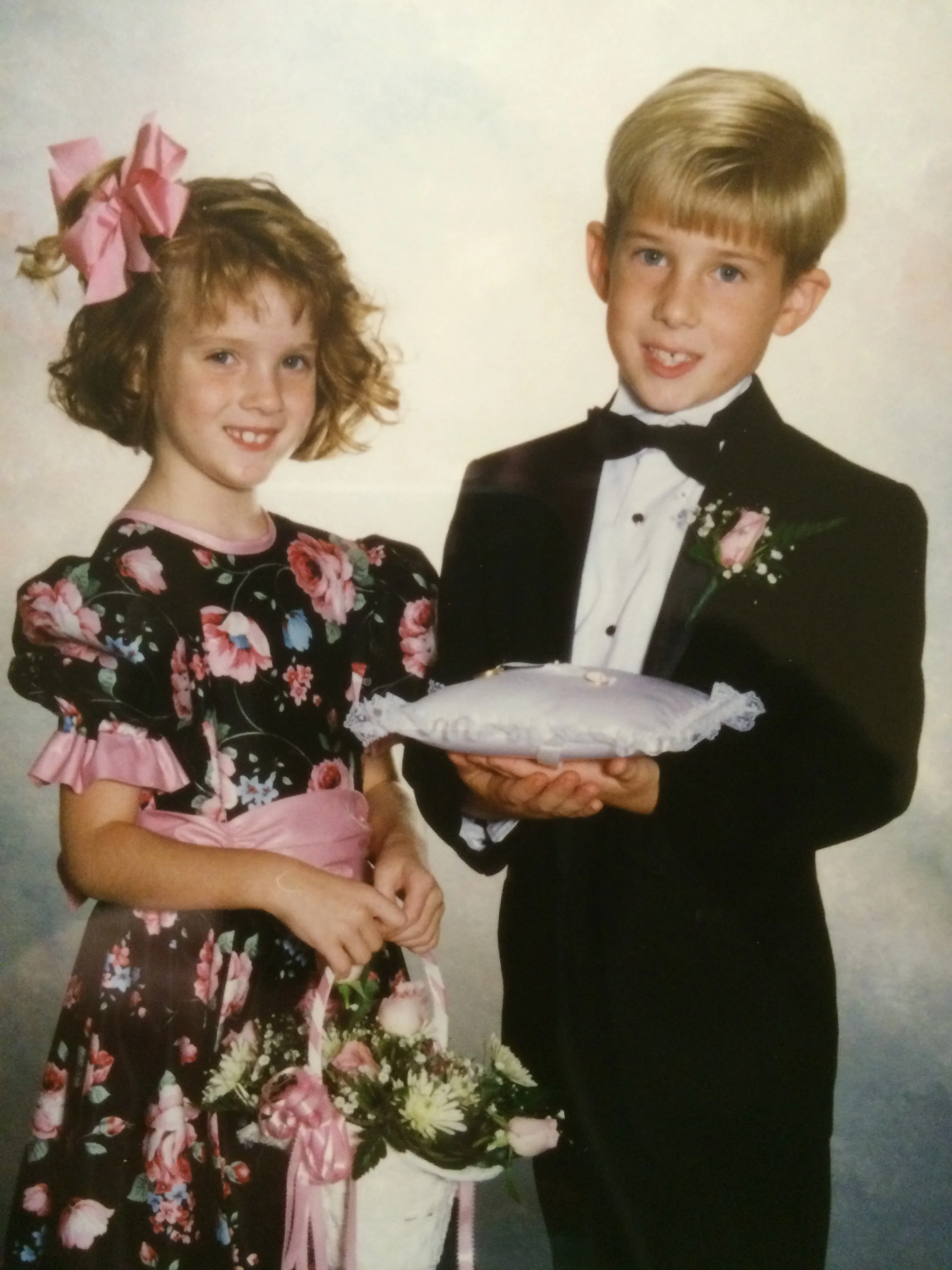 My cousin, Adam, and I as the ring bearer and flower girl in our aunt's wedding. Circa 1992